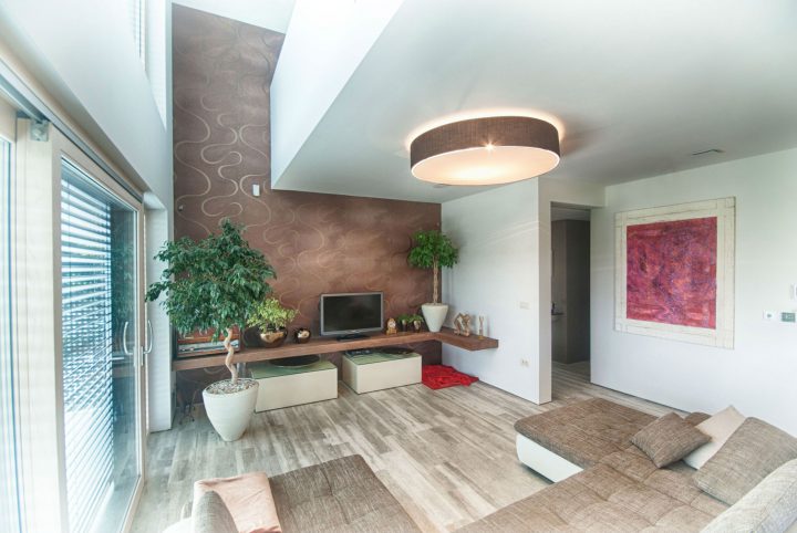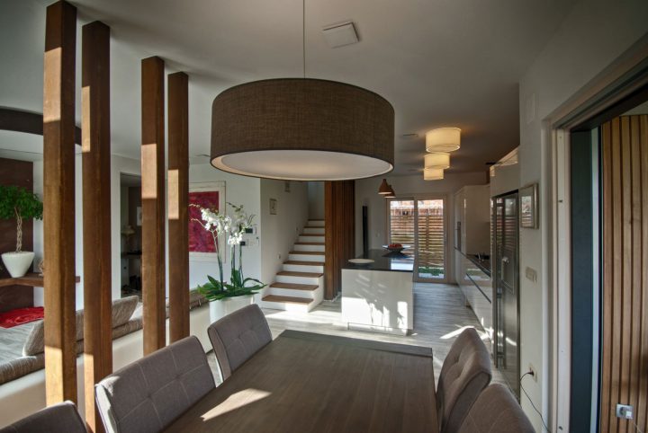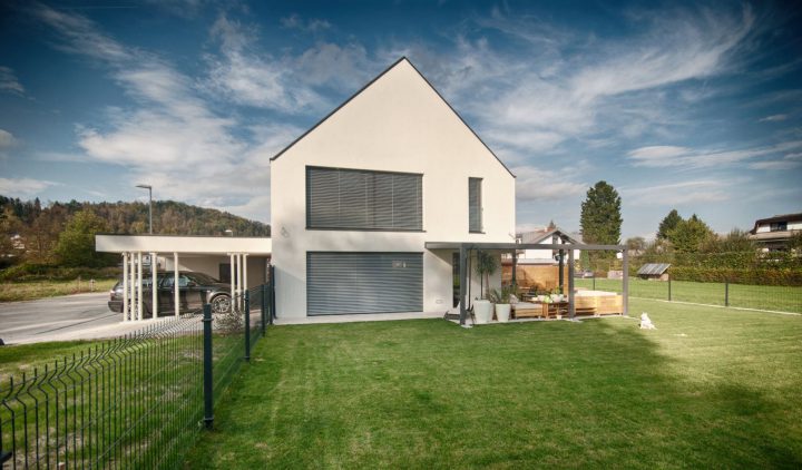 V Mengšu smo na robu naselja izvedli pasivno stanovanjsko hišo s popolnoma kvadratnim tlorisom, saj je kvadratna oblika tlorisa najbolj optimalna za doseganje pasivnega standarda. Notranja dvovišinska galerija nad bivalnim delom daje dodaten občutek prostornosti.
